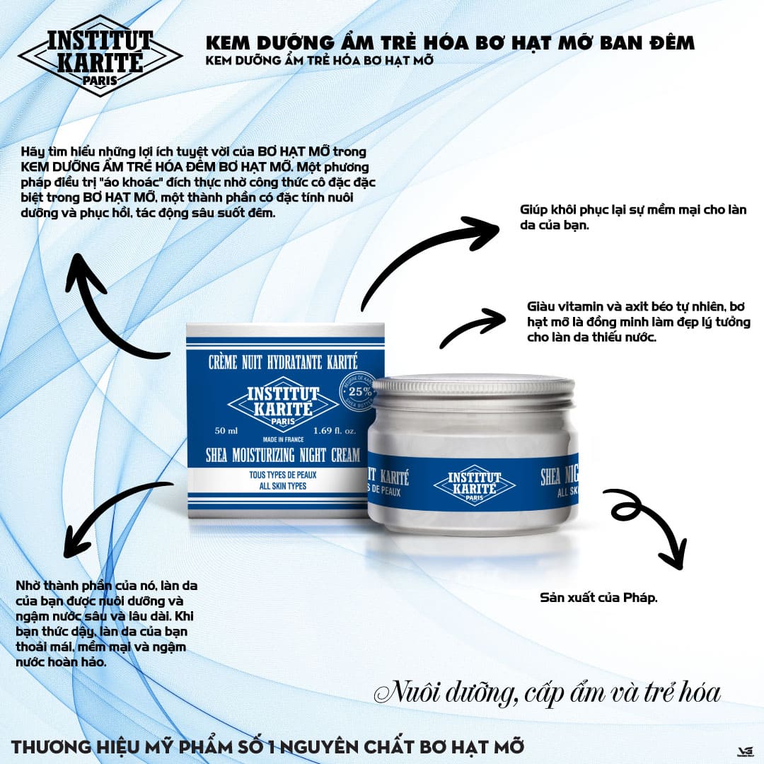 Tất cả các đặc tính dưỡng ẩm và nuôi dưỡng đặc biệt của Bơ hạt mỡ đều được tập trung trong Kem dưỡng ẩm ban đêm. Một chiếc kén ban đêm thực sự, loại kem này giúp bạn khôi phục lại sự mềm mại cho làn da của mình. Giàu vitamin và axit béo tự nhiên, bơ hạt mỡ là đồng minh làm đẹp lý tưởng cho làn da thiếu nước. Nhờ thành phần của nó, làn da của bạn được nuôi dưỡng và ngậm nước sâu và lâu dài. Nó lấy lại sự mềm mại và dẻo dai ngày này qua ngày khác. Khi bạn thức dậy, làn da của bạn rất thoải mái, mềm mại và được dưỡng ẩm hoàn hảo. Các đặc điểm của bạn được nghỉ ngơi và làn da của bạn rạng rỡ. Một phương pháp điều trị cực kỳ thoải mái cho mọi loại da. Thoa vào buổi tối lên mặt đã được làm sạch theo chuyển động xoay tròn từ dưới lên trên, không quên vùng cổ và ngực, để kích thích tuần hoàn và cải thiện khả năng hấp thụ các hoạt chất. Ngoài ra, hãy sử dụng cả kem dưỡng ẩm ban ngày Shea Moisturising Day Cream.